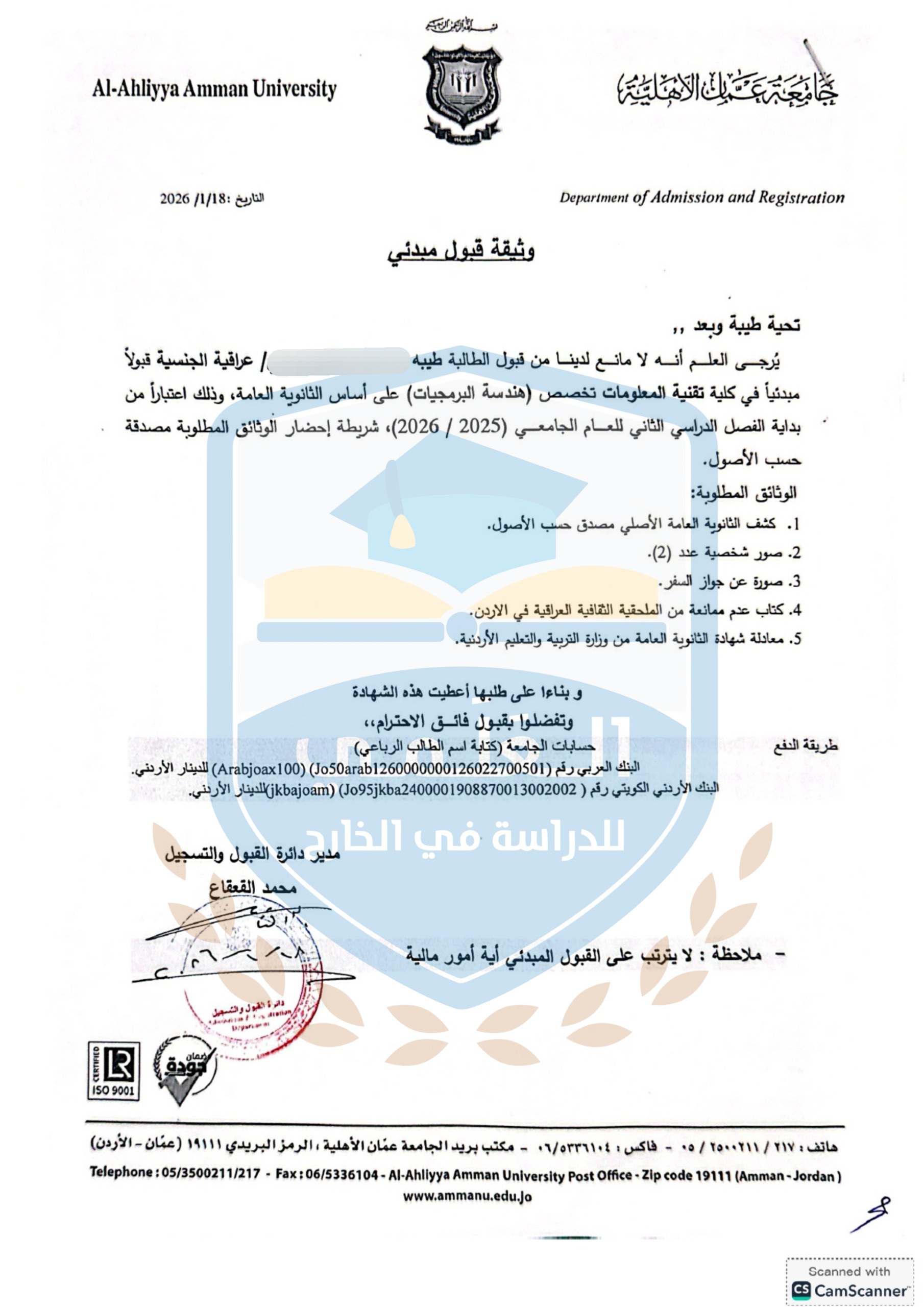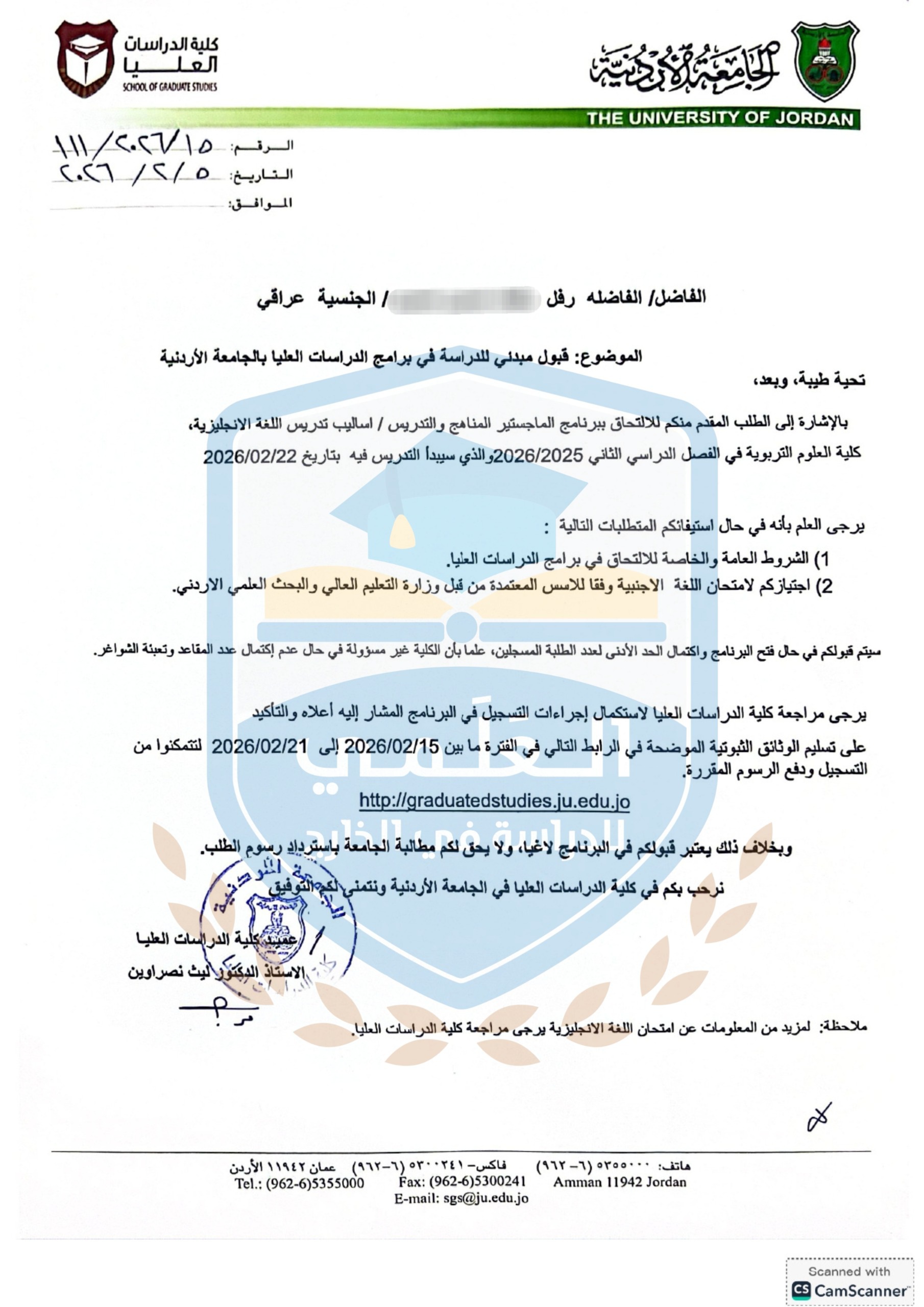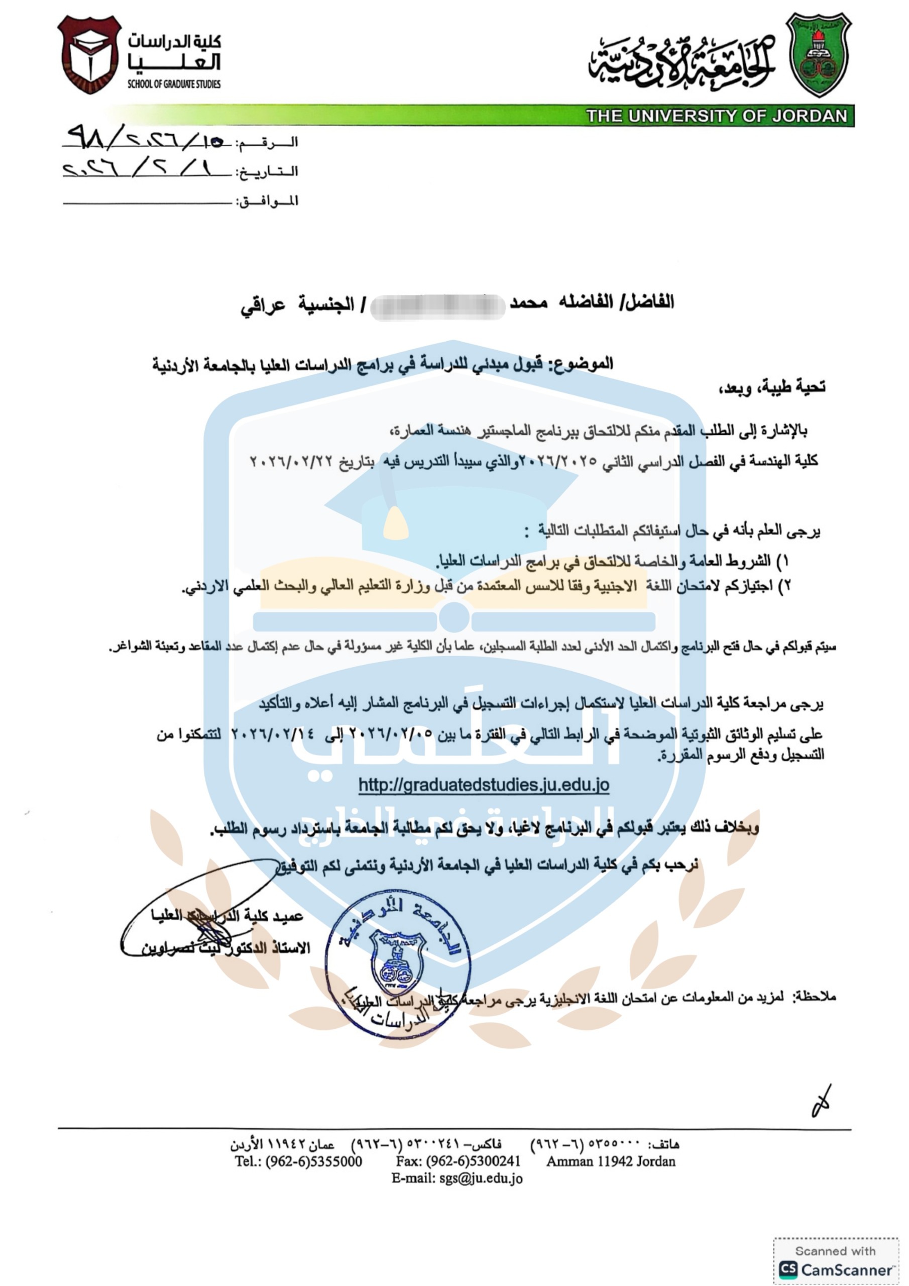 قبول الطالب محمد على الجامعة الاردنية الحكومية