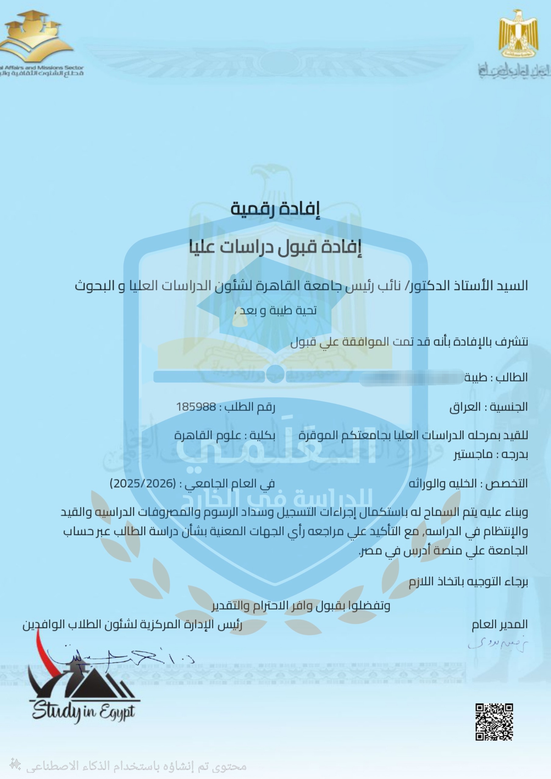 قبول طالبتنا طيبة على جامعة القاهرة في مصر
